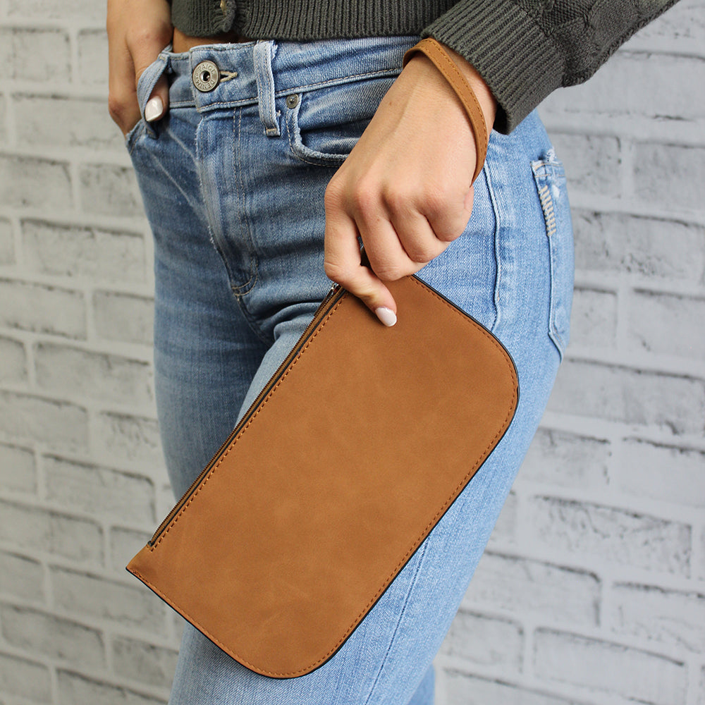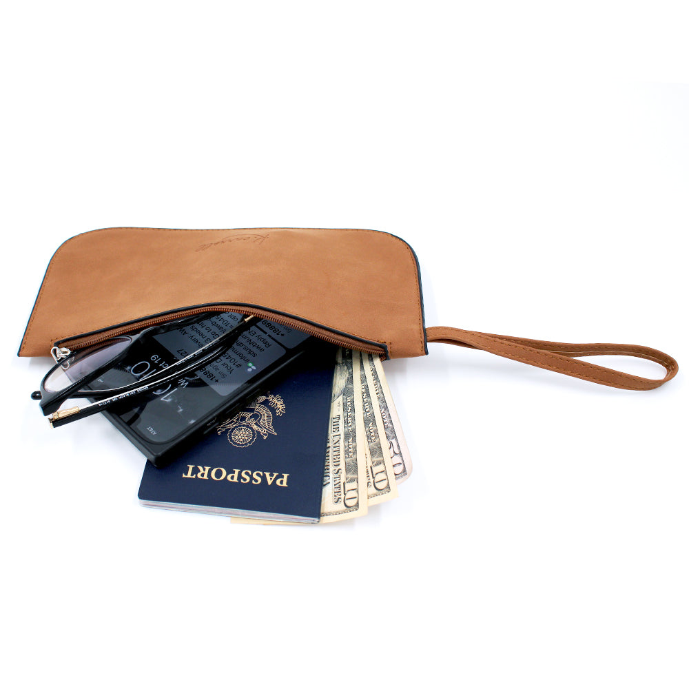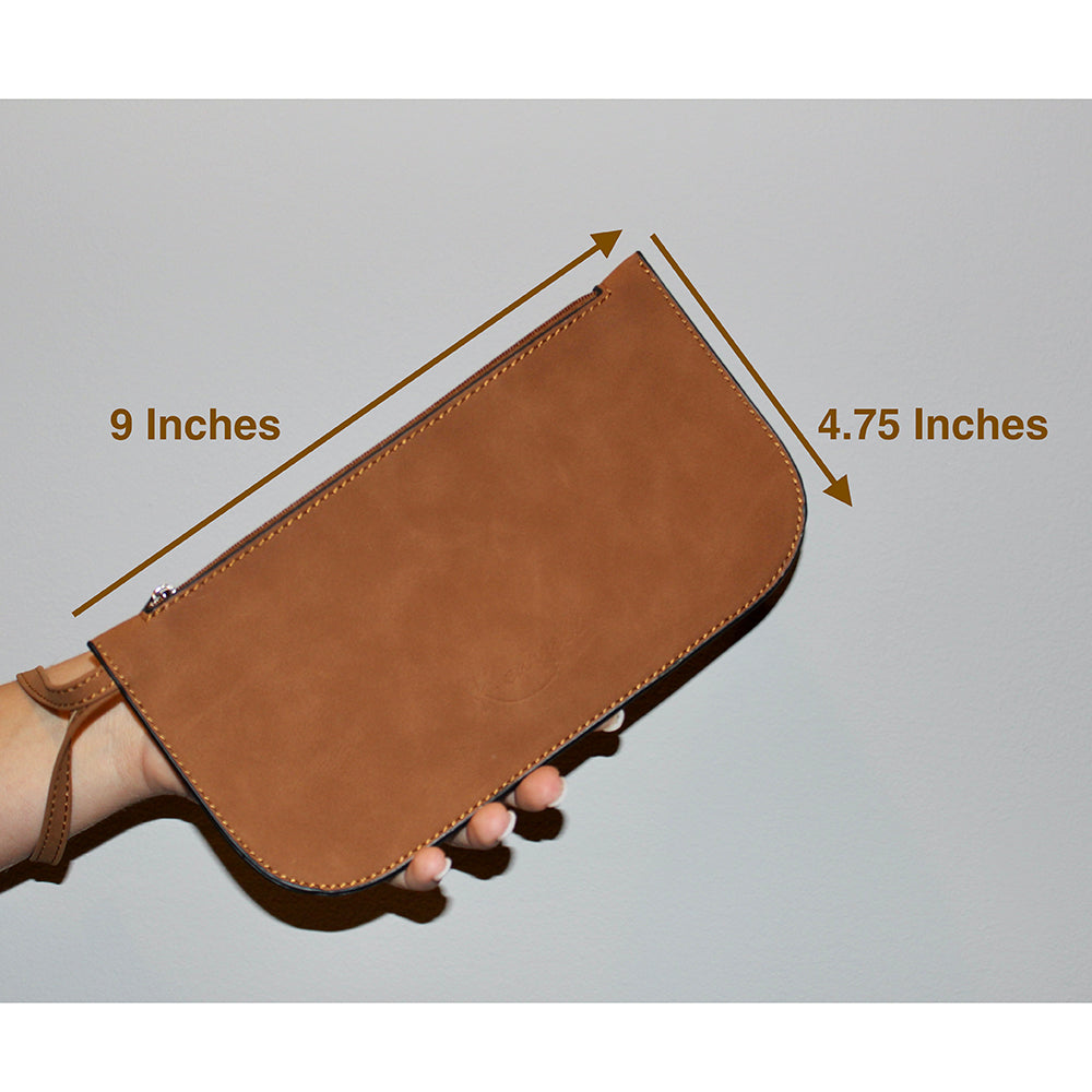 A wristlet with a simple design. Long enough to fit larger cell phones and wide enough to fit a passport. Top zipper closure is 7.25” long, opens wide enough to get in and out easily. A great little accessory to store all your special extras, like a lip stick and glasses. A perfect match to our faux suede Taylor Tote!