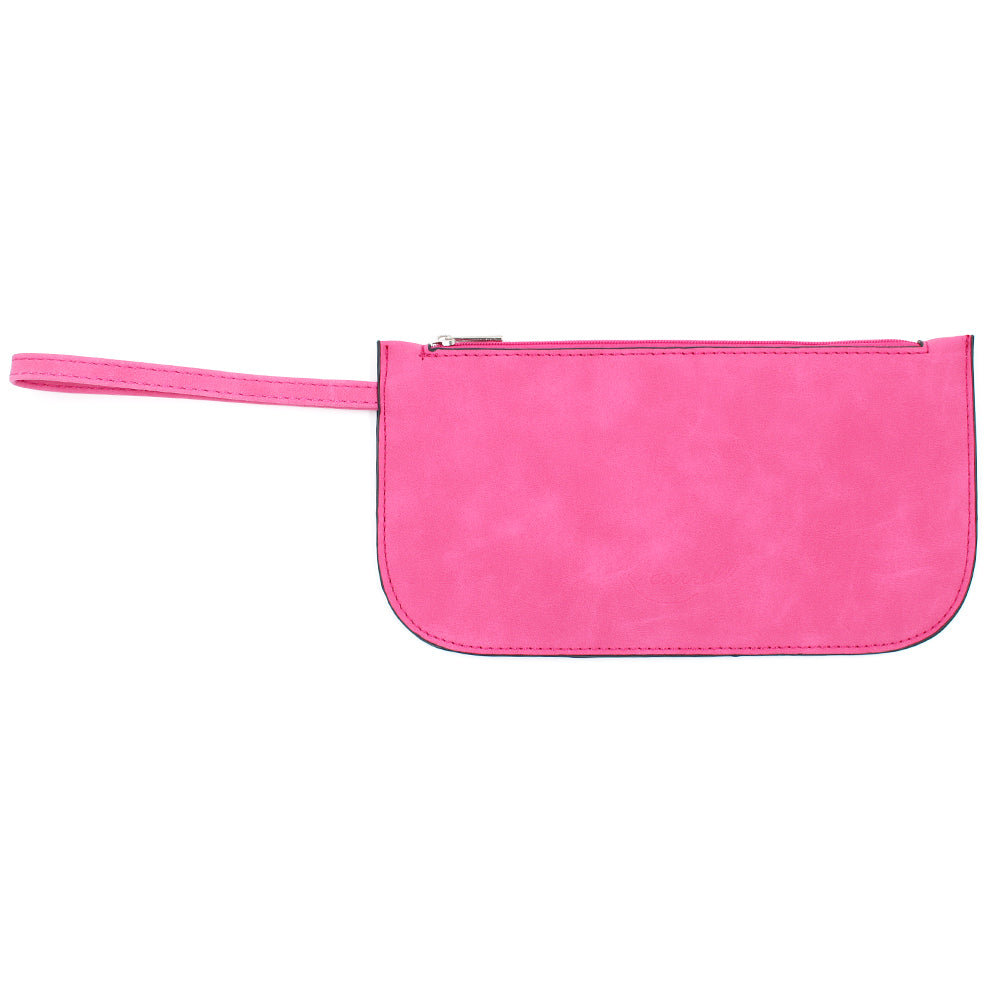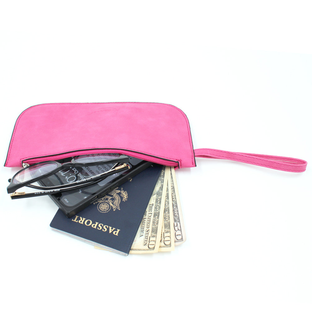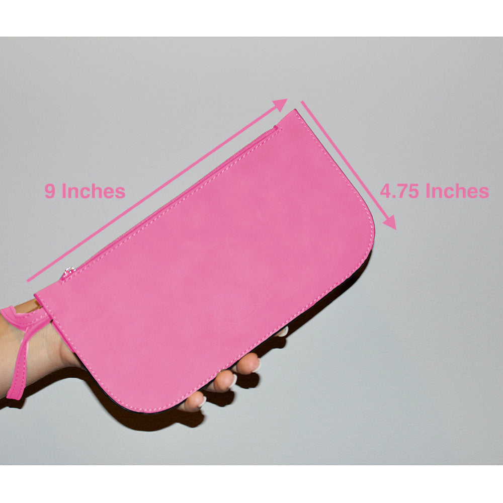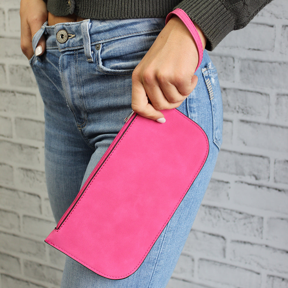 A wristlet with a simple design. Long enough to fit larger cell phones and wide enough to fit a passport. Top zipper closure is 7.25” long, opens wide enough to get in and out easily. A great little accessory to store all your special extras, like a lip stick and glasses. A perfect match to our faux suede Taylor Tote!