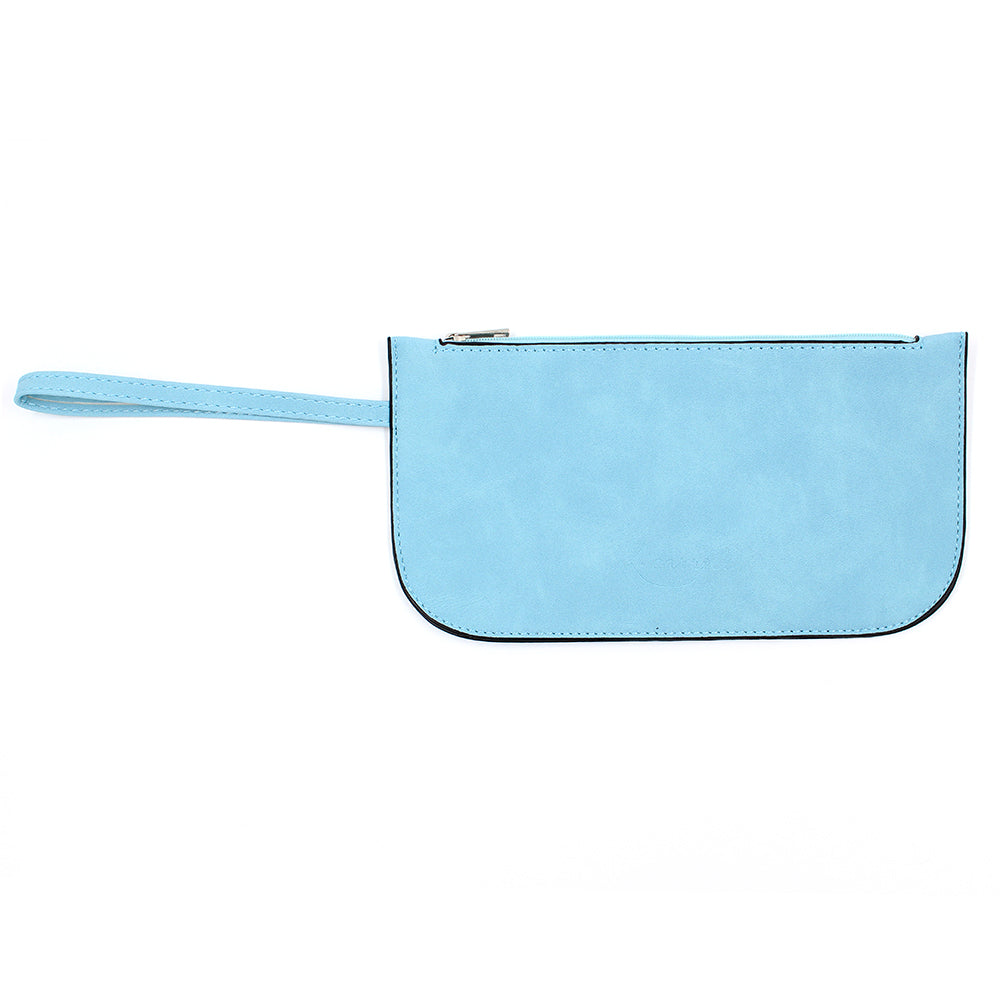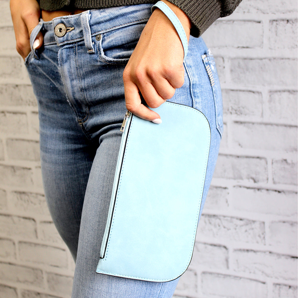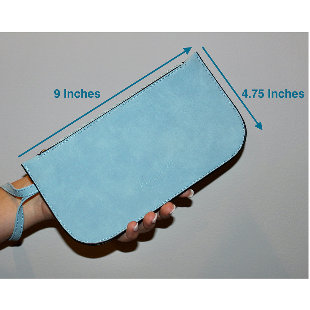 A wristlet with a simple design. Long enough to fit larger cell phones and wide enough to fit a passport. Top zipper closure is 7.25” long, opens wide enough to get in and out easily. A great little accessory to store all your special extras, like a lip stick and glasses. A perfect match to our faux suede Taylor Tote!