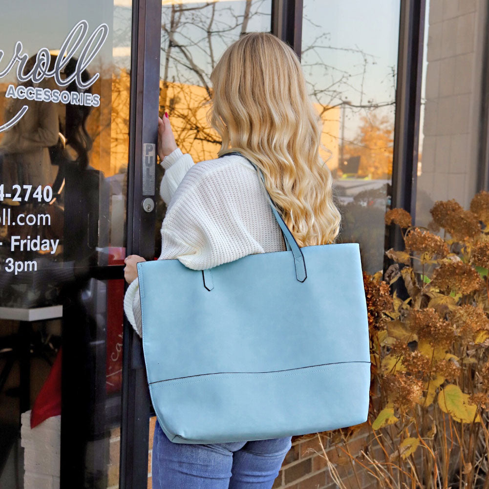 Our Taylor Tote, oversized and designed with faux suede, is honoring our founder’s daughter, Madison, on her recent wedding and her new last name, Mrs. Madison Carroll Taylor! Oversized open tote for carrying all your extras! Its simple versatility makes this tote both fashionable and functional.