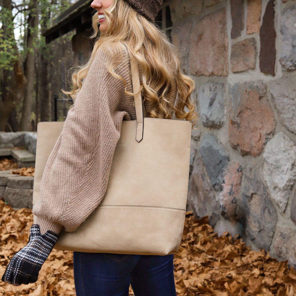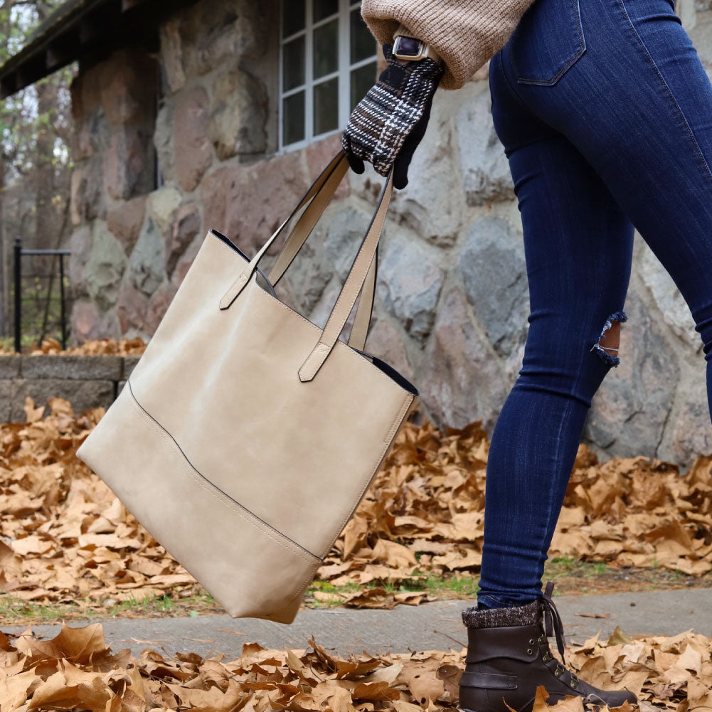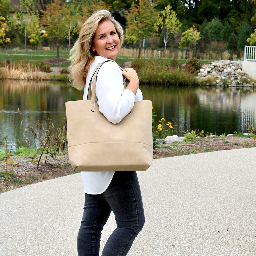 Our Taylor Tote, oversized and designed with faux suede, is honoring our founder’s daughter, Madison, on her recent wedding and her new last name, Mrs. Madison Carroll Taylor! Oversized open tote for carrying all your extras! Its simple versatility makes this tote both fashionable and functional.